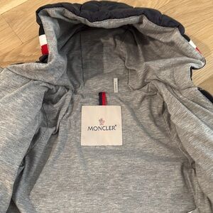 LIKE NEW Navy jacket by Moncler. Features red and white details. Ideal for warmth and style. Doesn’t look worn. No flaws. Puffer outer and soft grey lining on the inside, functional side button pockets, label across hood and logo on side arm