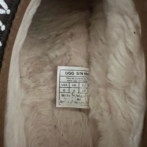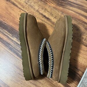 Cozy brown suede slippers featuring a stylish zigzag trim. Perfect for comfort and warmth.