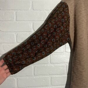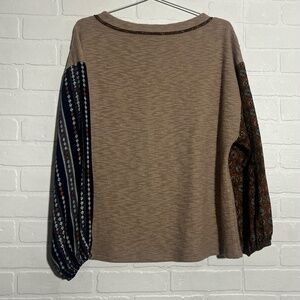 THML Womens Sweater Size Large Tan Multi-Color Mixed Print Balloon Sleeve Waffle Knit Boho Chic Unique Style