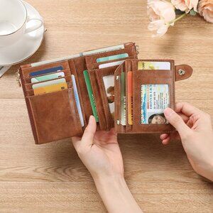 Leather RFID Blocking Wallet Female Bifold with Zipper Pockets and Card Slots