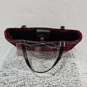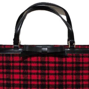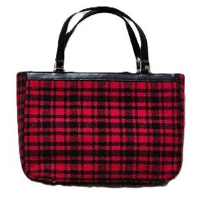 VINTAGE RETRO BLACK RED PLAID VEGAN WOOL & LEATHER HANDBAG