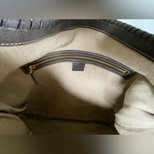 Its features include a single flat adjustable handle, detachable leather shoulder strap, signature bamboo and suede tassel, leather strap details around the bag, leather flap tab with gold bamboo push lock closure, beige canvas lined interior with one zip and two patch pockets, and gold tone hardware.