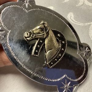Found this in the jewelry archives very very beautiful made in Hong Kong vintage horse belt, buckle, unsure of the material selling exactly as shown