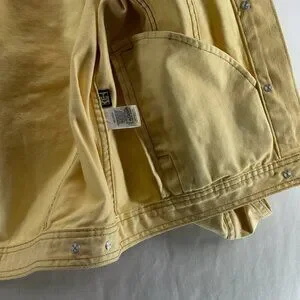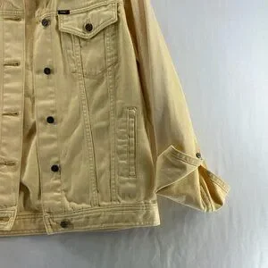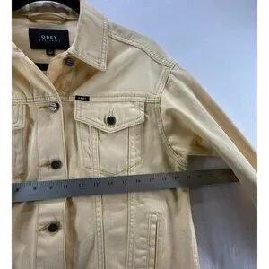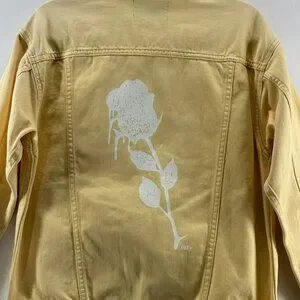 OBEY Denim Trucker Jacket Womens S Graphic Rose Button Front Long Sleeve Yellow