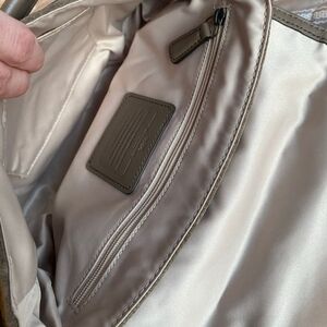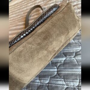 very cool brown suede and snake skin Coach purse. it has 2 straps, 2 hang tags. there is a spot on the inside flap - see photos. and the suede has some patina on the back flap - see photo. she is well made, very cool handbag or crossbody, from 2014