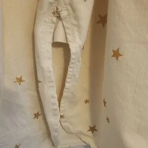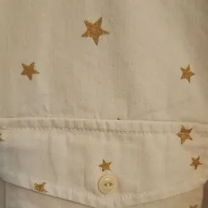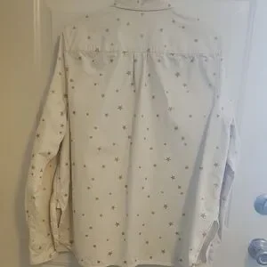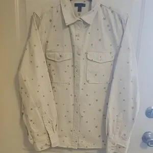 Stylish beige shirt jacket with star design. Perfect for layering. Features button closure and chest pockets. 28 inches long. 23.5 inches wide. 26 inch sleeve