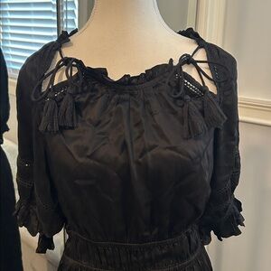 This Satin Maxi Dress From Cleobella features a smocked elastic waist with a ruffle neckline & tie details.