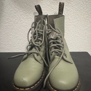 Stylish olive green Dr. Marten combat boots. Durable leather. Iconic yellow stitching. Comfortable fit. Worn a few times.