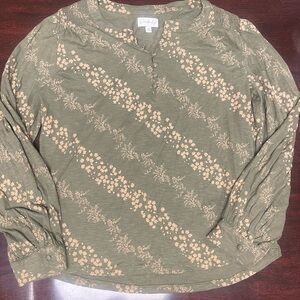 Chic olive blouse with tan floral pattern. Long sleeves and button details. Perfect for versatile styling.
