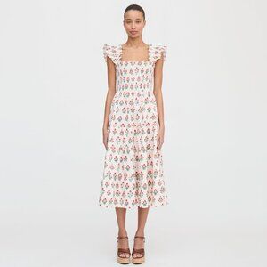 The Ellie is an A-line Nap Dress® with our proprietary, elasticated Nap Smocking, ruffled shoulders, tiered midi skirt, and pockets