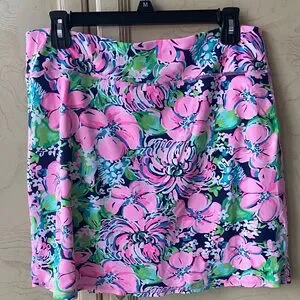 Vibrant floral skort. Features pink and green hues. Perfect for a sunny day.