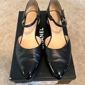 CHANEL black leather flats with patent leather touches in the toe and heel. Heel patent similar to quilted bag. Flats are excellent with slacks or skirts. These have been loved (worn well) but can be restored. Left shoe missing the CC.