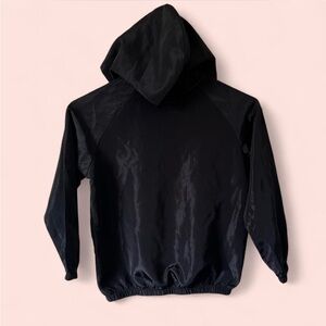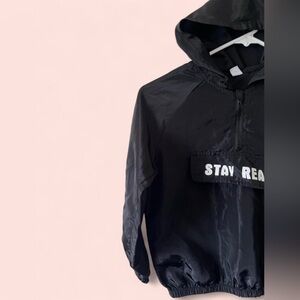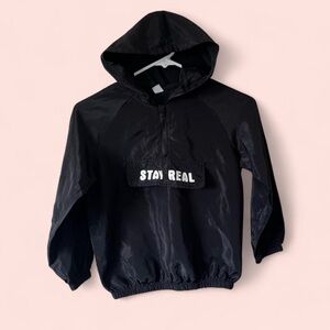 Boys size 7 black & white long sleeve pullover hooded windbreaker. Elastic cuff sleeves & hem. “STAY REAL” printed on the front. Flap without pocket, added for style.