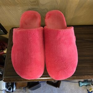 Cozy, plush slippers and soft material. Easy slip-on design with velcro. These bright pink mules have great arch support. Barely worn, as shown in pictures, no wear and tear