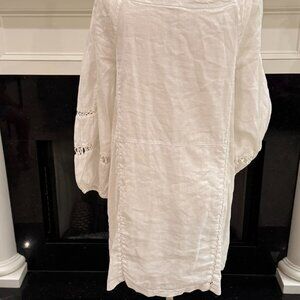 Effortless and bohemian, this Free People white peasant dress is made with soft cotton and features delicate lace insets throughout. Designed with puff sleeves, a square neckline, and a relaxed silhouette, it’s both feminine and easy to wear. The body is fully lined for coverage, while the sleeves remain airy and sheer. Perfect for festivals, vacations, or casual summer outings.