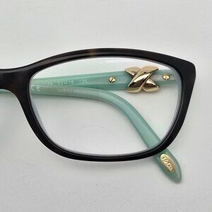 This listing is for authentic Tiffany & Co TF2074 8134 Havana on Tiffany Blue Cat Eye Eyeglasses Frame w/ Case Italy 52-16-135. Current lens are unknown Rx prescription and will need to be replaced with lens of your choice (FRAME ONLY). Eyeglasses frame is in fair/good pre-owned condition, with light wear and missing 1 inner temple screw (see photos). Size: 52-16-135. Made in Italy. Tiffany & Co hard case and micro fiber cleaning cloth included in listing. Please see pictures to make your complete condition assessment.