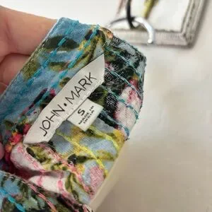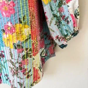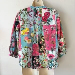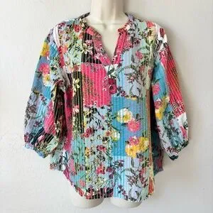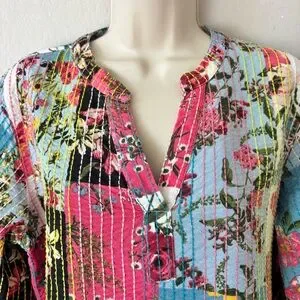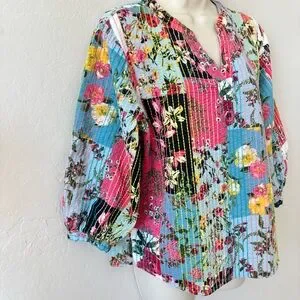John Mark Multicolor patchwork kantha style Floral split neck 3/4 Sleeve Top