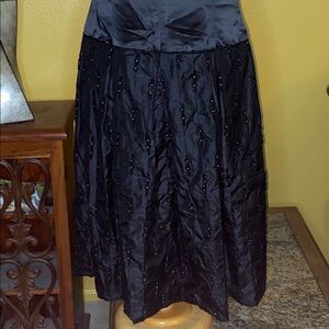 Shine at any event with this elegant formal dress featuring a silk taffeta bodice with a silk beaded A line skirt with pleats. Back zipper.