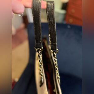 This stylish tote bag features a sophisticated black and cream design, perfect for any occasion. The elegant chain straps add a touch of luxury, making it a must-have accessory.