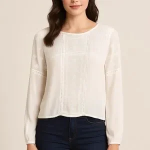 • Details: Delicate embroidered floral pattern on front and sleeves, lace panel details, button closure at back neckline, lightweight semi-sheer fabric (may need layering or cami underneath)