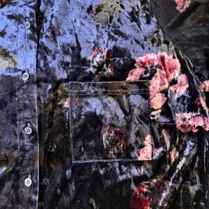 Perfect for autumn! Women's velvet long sleeve top in a size 1x. Dusty rose, soft pink flowers on a navy blue back ground. Oxford button up (button down) with collar. Front pocket over left breast. See photos for measurements. Very good condition.