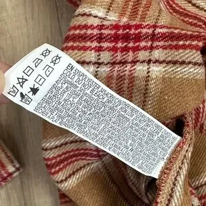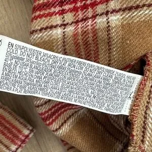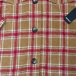 Stylish plaid button-up jacket with red and tan colors. Features front pockets and button cuffs.