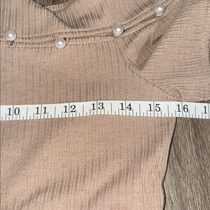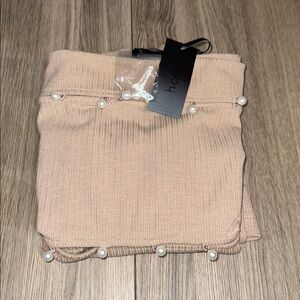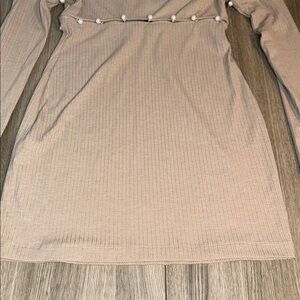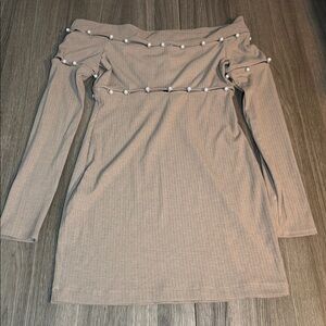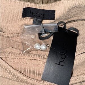 Brand new with tags. Gorgeous h:ours (Revolve) Delhia mini dress in a neutral camel/beige tone. Features a flattering off-the-shoulder neckline with chic pearl embellishments along the neckline, bodice and sleeves. Soft ribbed stretch fabric for a body-hugging, comfortable fit—perfect for parties, cocktail events, birthdays or date night.