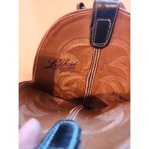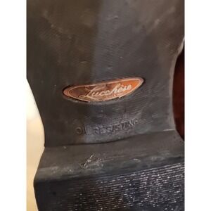 Elegant Lucchese cowboy boots. Rich brown leather with black accents. Intricate stitching design.