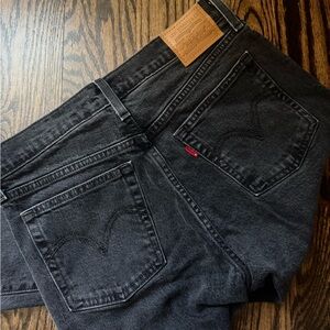 High waist bootcut jeans by Levi's. Black/dark gray wash. Size W28XL34. Button down fly. Tags removed but they have never been worn. In excellent condition.