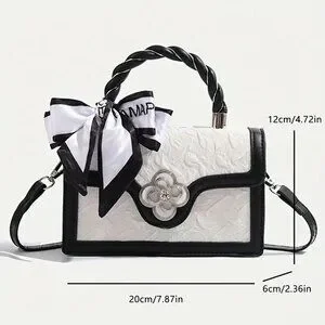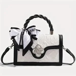 Black/White Floral Mini Crossbody Top Handle Bag w/ Twilly Bow