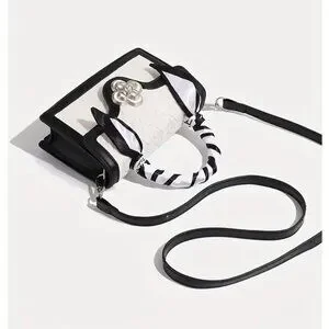Sweet and stylish in black and white, this mini has a textured floral front, a detachable crossbody strap, and a flower charm. The striped twilly is the fun partโwrap it around the handle or tie a cute bow, whatever you prefer.