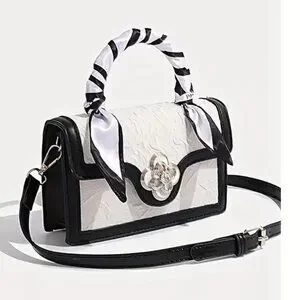 Chic Black/White Textures Floral Mini Crossbody Top Handle Bag w/Twilly