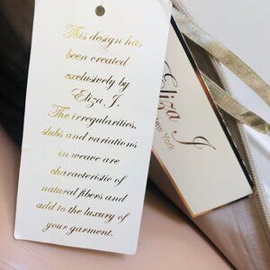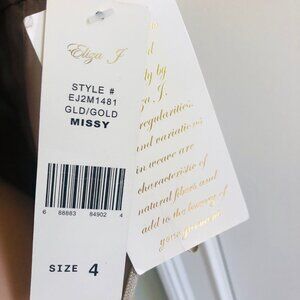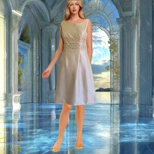 ELIZA J Classic cocktail and evening wear style dress embodies understated elegance with timeless tailoring and subtle embellishment. Intricate beading and rhinestone embroidery across the waistline creates a refined and decorative touch and adds just enough glamour without being overly ornate. Sleeveless, side zipper, knee length and cream color lining. Wide scoop neckline in the front and a deeper scoop in the back, offering a classic and elegant silhouette. Crafted from a pale champagne gold color with a subtle sheen makes it ideal for evening wear. Length 37 Inch Bust 31 Inch Labeled Size 4 NEW with TAGS