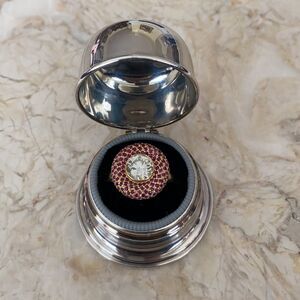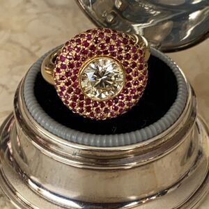 Stunning one of a kind custom made in France, solid 18K yellow gold halo style ring featuring a massive and rare 2.10 carat round brilliant cut diamond solitaire surrounded by 138 square cut natural rubies. This is a rare, vintage and absolutely stunning estate piece and comes in antique Birks sterling silver ring box. Professional appraisal will be included. One of the photos is for diamond size comparison, it shows it along with my diamond engagement ring which is 1.30 carats. Colour J-K Clarity VVS2 Total weight of diamond & ruby ring 15.06gm From smoke and pet free home Ships from Victoria, BC Once purchased it will go directly to Poshmark headquarters for authentication.