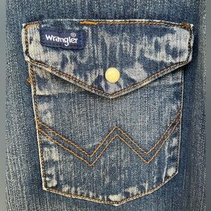 Fabulous, super soft, intentionally distressed “Cowboy Cut” denim shirt by WRANGLER. Sz Large Tall. About 24.5” seam to seam across chest front x 34” from base of back collar to bottom hem. Pearl snap buttons. Cool raw hem. Hubby only wore this a few times, but he’s since lost weight. Looks great untucked or tucked, layered over tees and thermal shirts. Non-smoking. Fast ship.