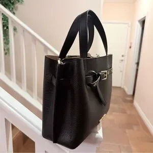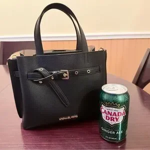 Chic black satchel by Michael Kors. Features elegant gold accents and a stylish buckle detail.