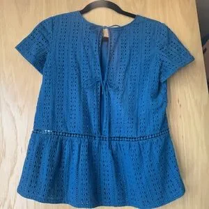 Sezane blue eyelet short sleeve 100% cotton top, partially open back with ties, size 36. Very good condition.