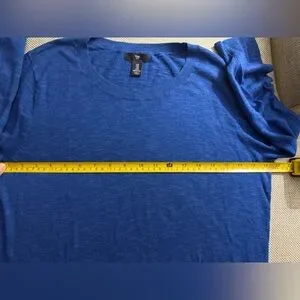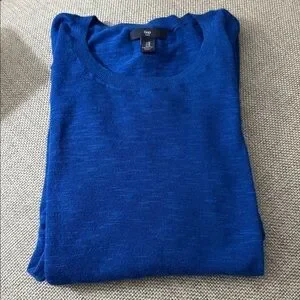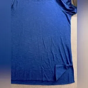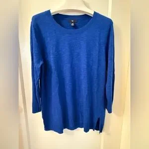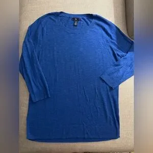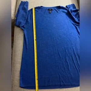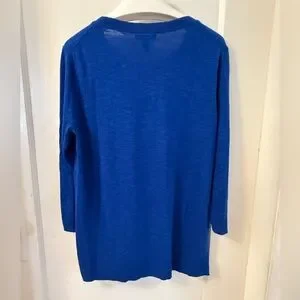 Beautiful blue 3/4 sleeve sweater measures approx 19.5 inches armpit to armpit; approx 25-25.5 inches mid-shoulder to hem. Ribbed sleeve cuff and at hem. 4.5 inch slits at either side at hem. Content tag cut off; was a thin cotton sweater (as I had another one identical to this style).