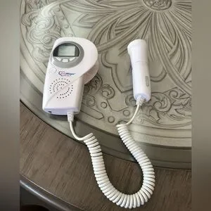 Baby Fetal Doppler White Monitor Sound Amplifier with digital display by BabyWhisper. Ideal for monitoring baby's heartbeat. Simple and easy to use. Lightweight and small makes it easy to carry around and fit in any bag. Batteries already included and ready for use! Features a coiled cord. In new condition.