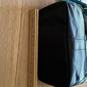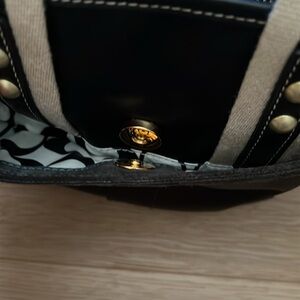 Stylish Coach Hampton tote bag in black satin with black and cream handles with gold accents. Blue stitching along the exterior pockets which has trim of dark brown suede, one is zippered and the other is snapped for easy access. Two Coach dog tags in two shades of turquoise with separate leather strip on chain on exterior pocket zipper. Purse is perfect for casual occasions, with a zip closure, lined interior, inner pockets and one zippered interior pocket for a touch of classic style. NWOT