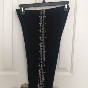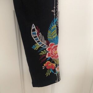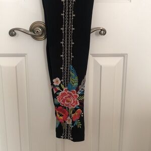 Black leggings by JW Los Angeles - ivory patterned embroidery down the legs with colorful designs at the bottom - size S - 95% cotton, 5% lycra