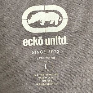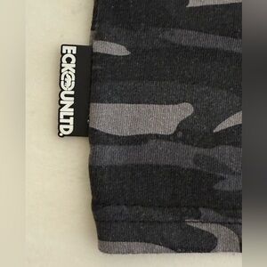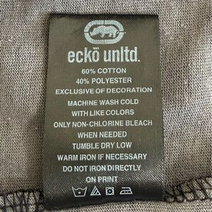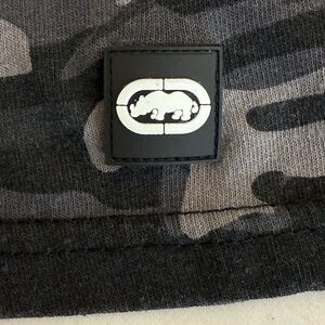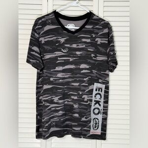 The ECKO Unltd Men's Short Sleeve T-Shirt is a stylish and versatile garment perfect for any man's wardrobe. This graphic tee features a camouflage pattern in gray and black, with a V-neckline for added style. Made of a comfortable blend of polyester and cotton jersey fabric, it is machine washable for easy care. The shirt is adorned with the Ecko Unltd. logo, giving it a touch of hip hop flair. Designed with a regular fit, this T-shirt is ideal for all seasons and can be worn throughout the summer, fall, and spring. Good condition with average wear.