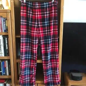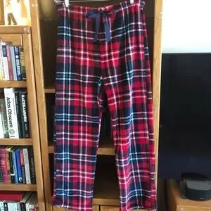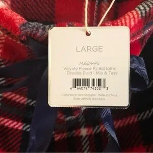 These NWT Mia & Tess pj bottoms have an elastic waist w/a ribbon tie, made of velvety fleece. The fabric is a soft 100% polyester in “fireside plaid”. Measurements length-40”, inseam-27”, rise-13”, and waist (side seam to side seam)-16 not stretched. These pajama bottoms have no call outs and are a size large.