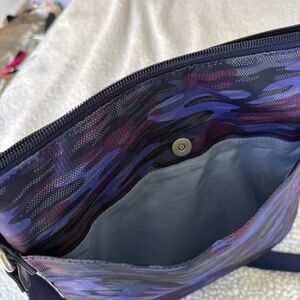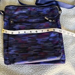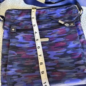 Multicolored blue with purple accents on bag, measures 10” by 10”. Several pouches and pockets for security. Difficult to cut strap for extra layer of protection. These bags can be machine washed if necessary.