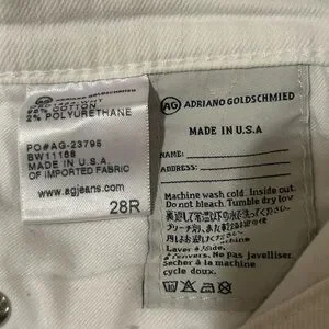 The AG Adriano Goldschmied Prima Mid Rise Cigarette White Jeans are a stylish and versatile addition to any woman's wardrobe. Made from a blend of polyester, polyurethane, and cotton, these extra-slim fit jeans feature a solid white color with a medium fabric wash. The mid-rise waist and zip closure offer a comfortable and flattering fit, while the 5-pocket design adds functionality to these skinny jeans. Perfect for all seasons, these machine washable jeans are a must-have for any fashion-forward woman looking for a chic and timeless style. These jeans retail for $215.