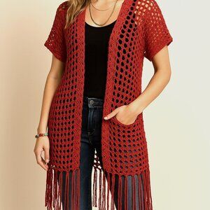 UMGEE RED CROCHET KNIT FRINGE CARDIGAN SZ M