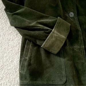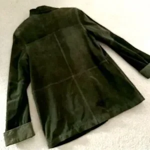 Elegant dark green suede jacket. Features button closure and front pockets. Perfect for layering.