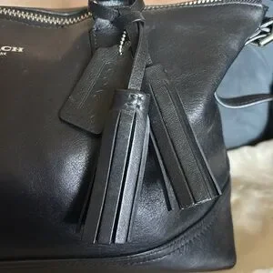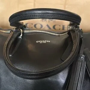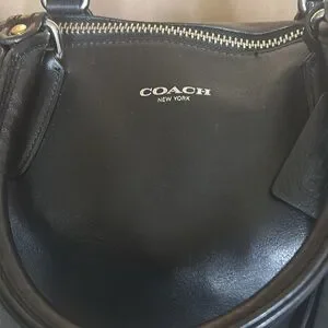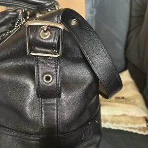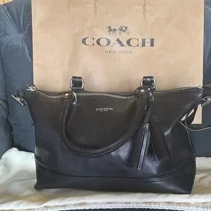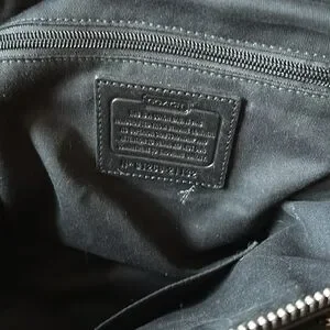 This Coach Legacy Molly handbag is a stylish addition to any wardrobe. With a satchel/doctors bag shape and zip closure, it features a large size of 12.5" width, 9.5" height, and 5.5" depth. The black leather exterior is accented with silver hardware, giving it a classic and metal theme. The bag has a shoulder strap, making it easy to carry. It also has inner pockets for added convenience. The fabric lining and adjustable strap add to its versatility. This Coach Legacy Molly handbag is a must-have for any fashion-forward woman
