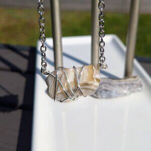 This handmade necklace features a unique specimen of Mexican lace agate tumbled and polished by yours truly! The stone exhibits striking banding characteristic of this particular variety of agate, and it is wrapped in a silver plated wire cage. Together with the silver-tone metal chain and lobster clasp closure, the total length of the necklace is 17 inches.
