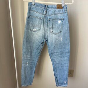 AE mom jean in straight fit, light wash with zipper closure. Designed with flattering high rise fit, straight leg cut, and matching ripped knee. Classic 5 pocket style.